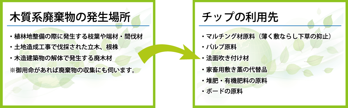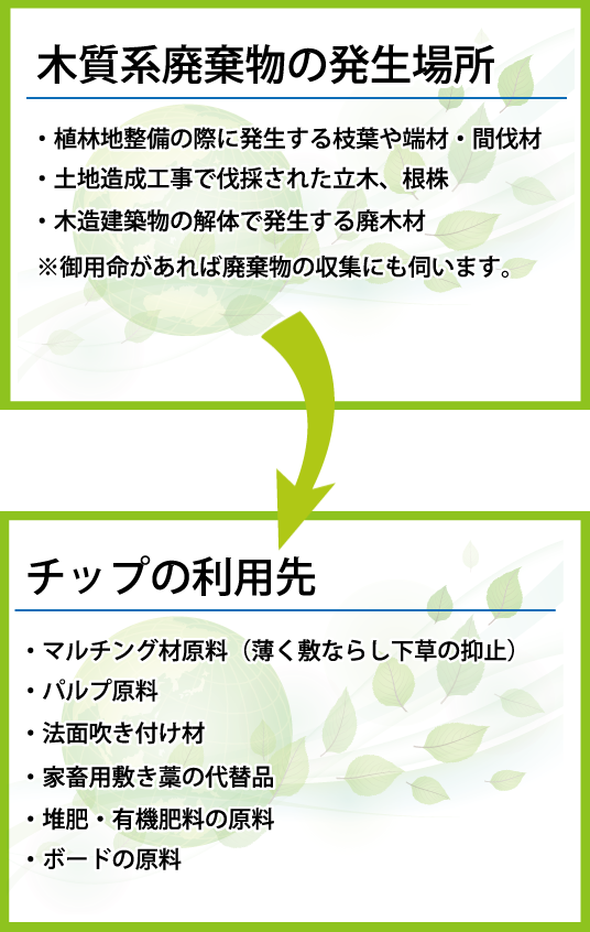 今まで焼却処分されていた植物廃材をチップ化することにより、新しい資源としての命が芽生えるのです。